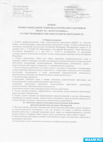 Кодекс профессиональной этики педагогических работников МБДОУ д/с "Золотая рыбка"